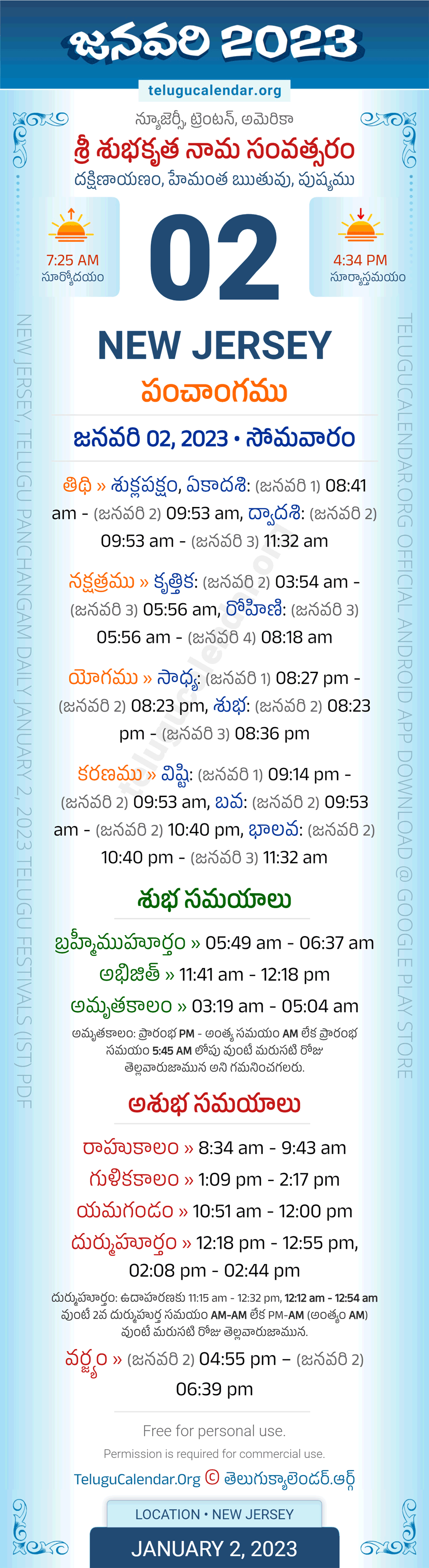 Download » January 2, 2023 » New Jersey (USA) Telugu Panchangam Daily Sheet with Auspicious and Inauspicious Timings.