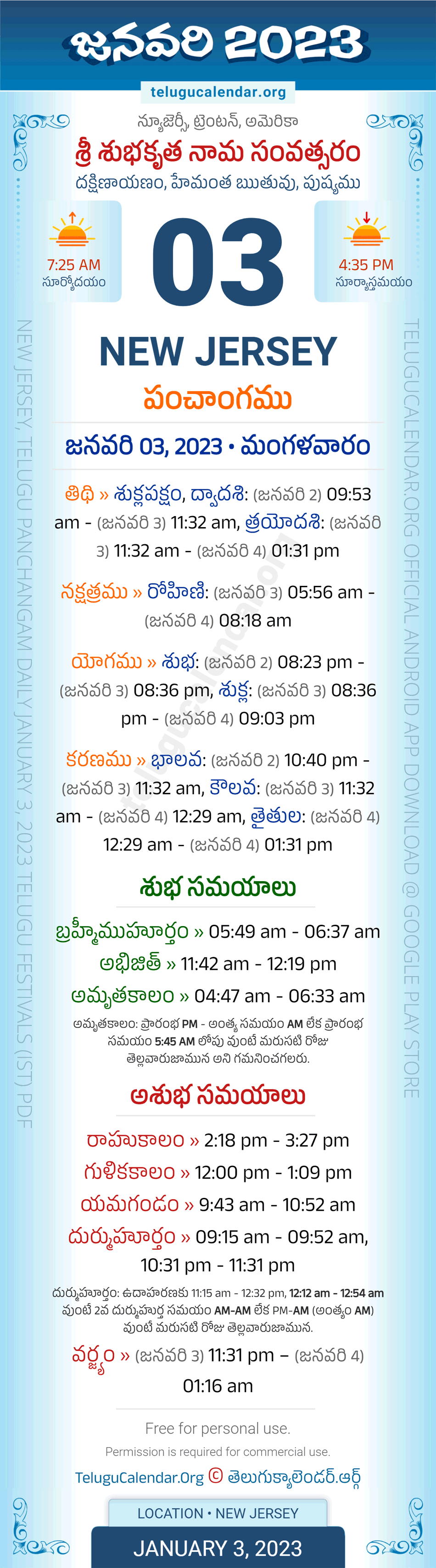 Download » January 3, 2023 » New Jersey (USA) Telugu Panchangam Daily Sheet with Auspicious and Inauspicious Timings.