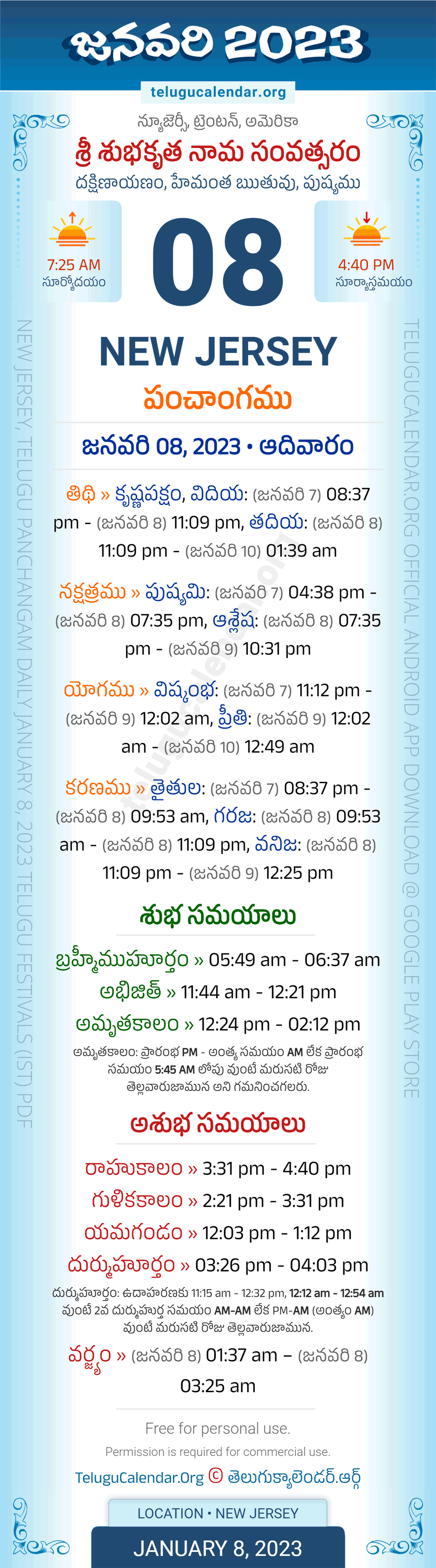 Download » January 8, 2023 » New Jersey (USA) Telugu Panchangam Daily Sheet with Auspicious and Inauspicious Timings.
