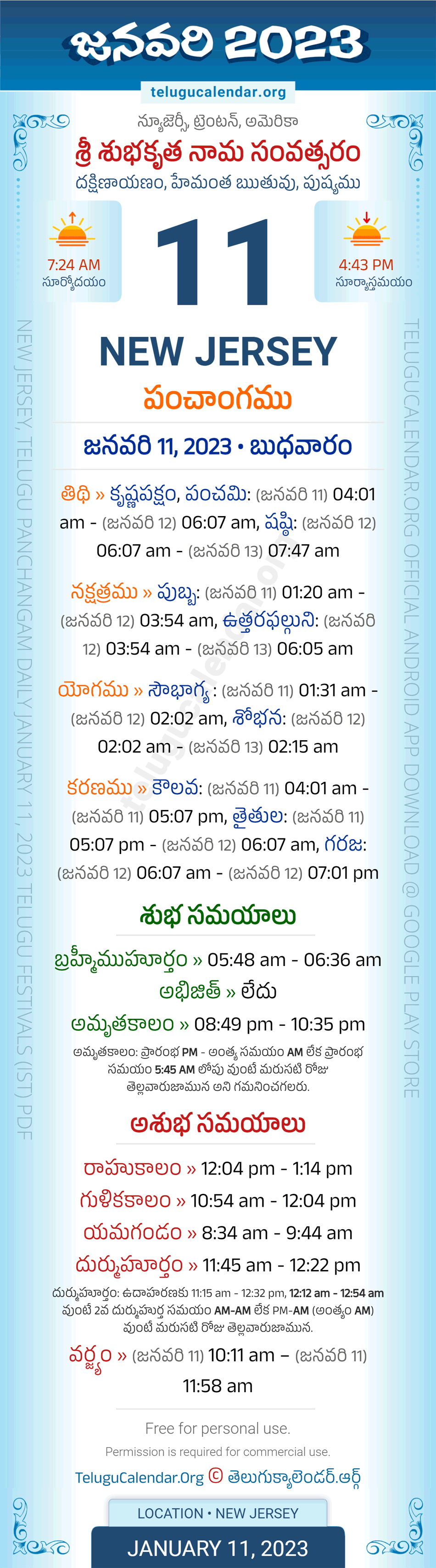 Download » January 11, 2023 » New Jersey (USA) Telugu Panchangam Daily Sheet with Auspicious and Inauspicious Timings.