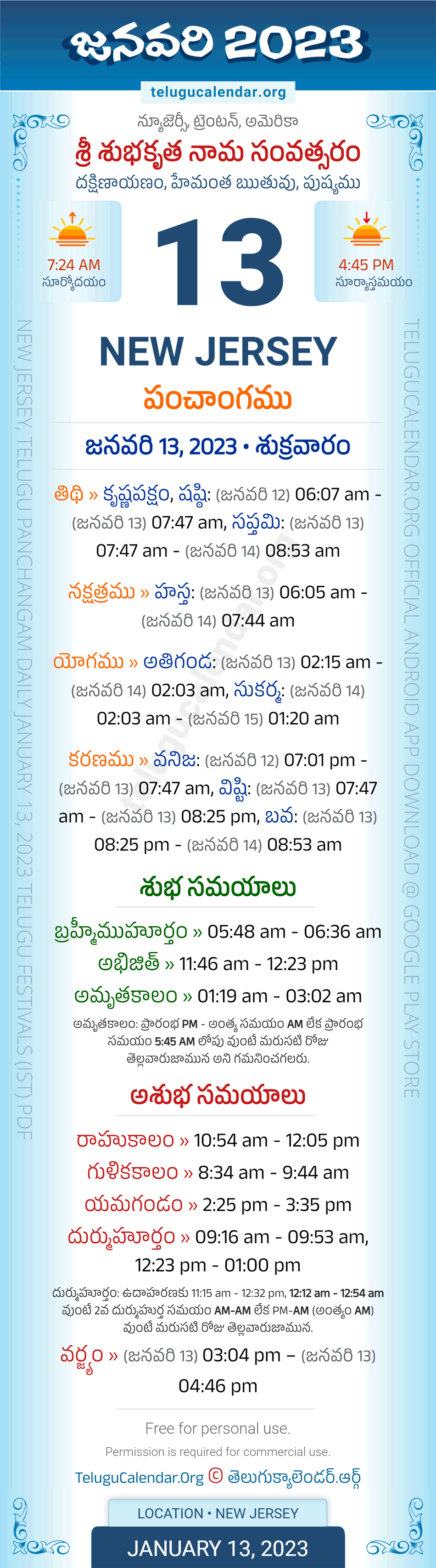 Download » January 13, 2023 » New Jersey (USA) Telugu Panchangam Daily Sheet with Auspicious and Inauspicious Timings.