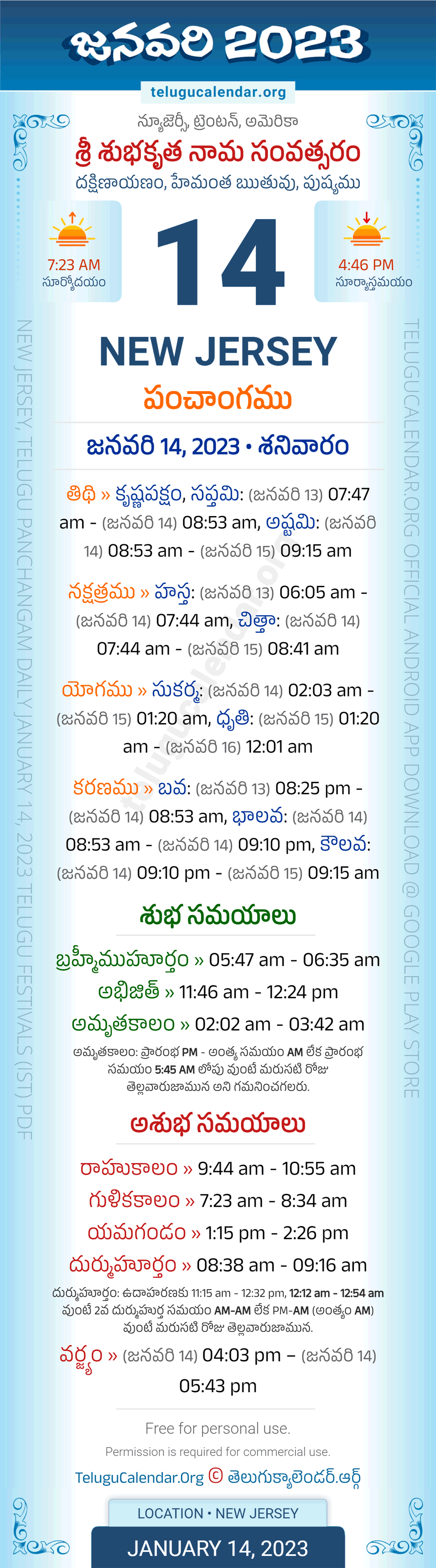 Download » January 14, 2023 » New Jersey (USA) Telugu Panchangam Daily Sheet with Auspicious and Inauspicious Timings.