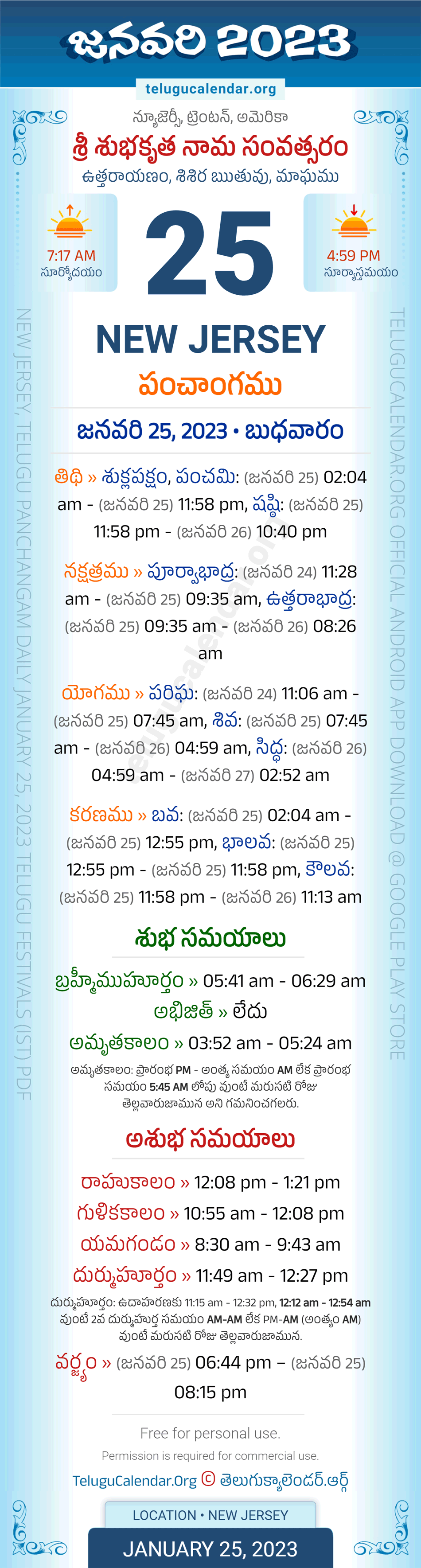Download » January 25, 2023 » New Jersey (USA) Telugu Panchangam Daily Sheet with Auspicious and Inauspicious Timings.