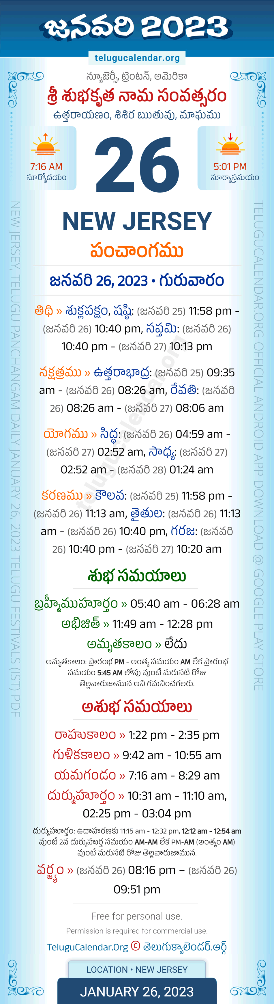 Download » January 26, 2023 » New Jersey (USA) Telugu Panchangam Daily Sheet with Auspicious and Inauspicious Timings.