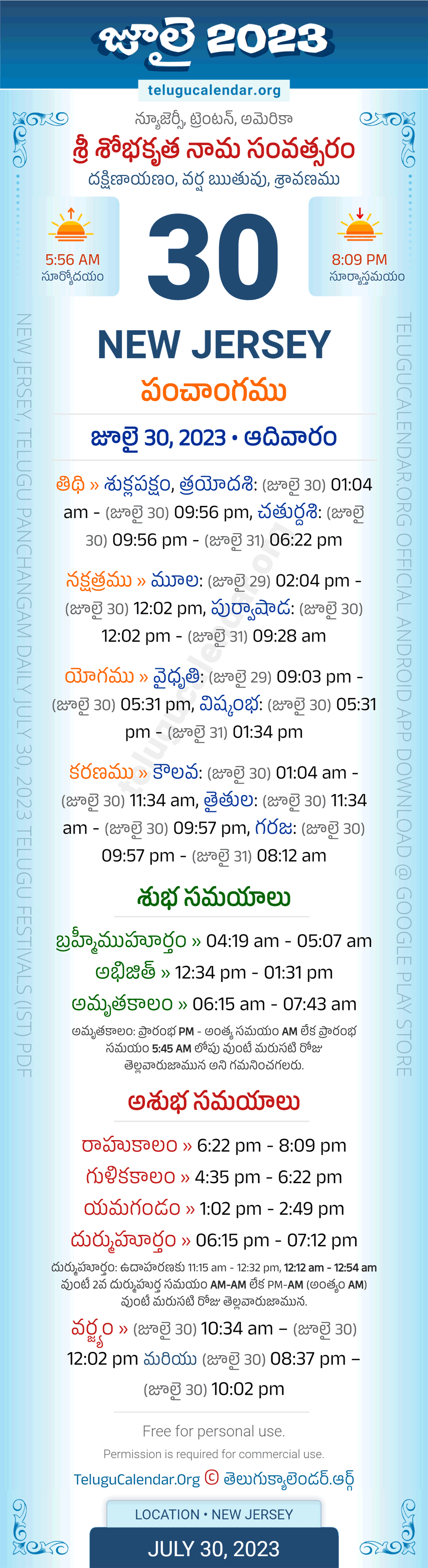 Download » July 30, 2023 » New Jersey (USA) Telugu Panchangam Daily Sheet with Auspicious and Inauspicious Timings.