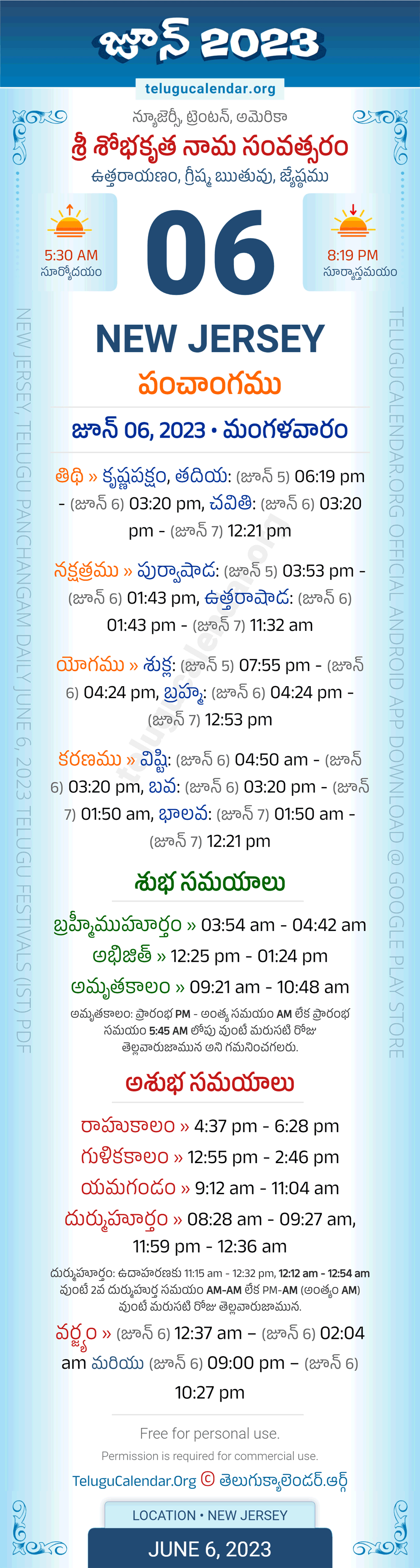 New Jersey Panchangam June 6, 2023 Daily Sheet in Telugu... New Jersey Telugu Panchangam Tuesday, June 06, 2023, Today's New Jersey Tithi: Krishna Paksham, Thadiya: (Jun 5) 06:19 pm - (Jun 6) 03:20 pm, Chavithi: (Jun 6) 03:20 pm - (Jun 7) 12:21 pm, Today's New Jersey Nakshatram: Purva Ashadha: (Jun 5) 03:53 pm - (Jun 6) 01:43 pm, Uttara Ashadha: (Jun 6) 01:43 pm - (Jun 7) 11:32 am, Telugu Year: Sri Sobhakritu Nama Samvatsaram, Vedic Aayana: Uttarayanam, Vedic Rutuvu: Grishma, Chandramasa (Amanta): Jyeshtamu. Below image showing information about the 5 attributes of the day, viz., Varam, Tithi, Nakshatram, Yogam & Karanam along with starting and end timings. Read more