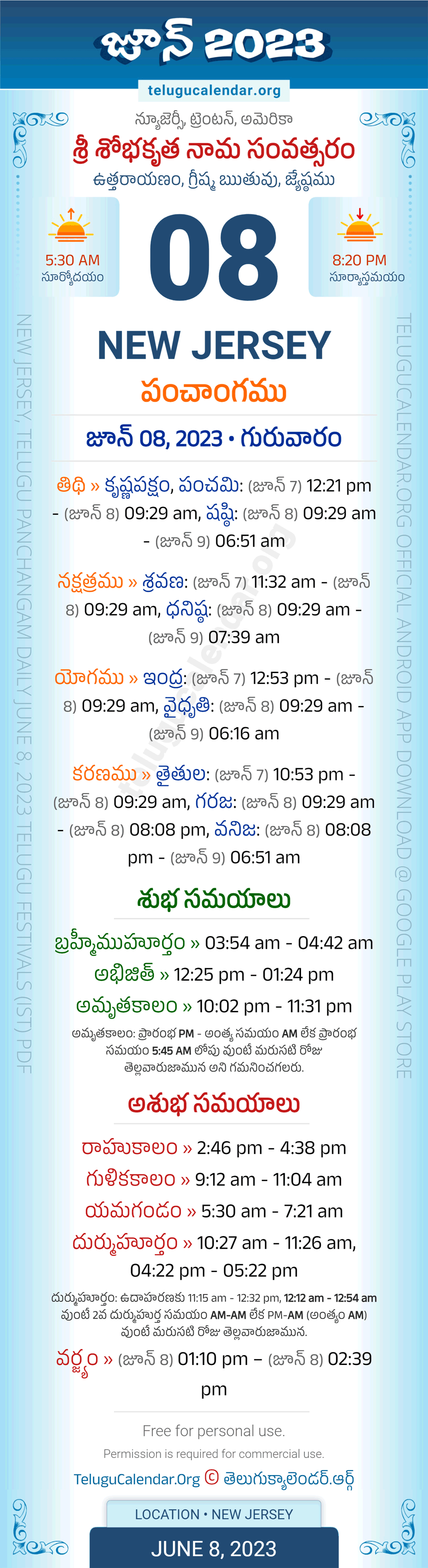 Download » June 8, 2023 » New Jersey (USA) Telugu Panchangam Daily Sheet with Auspicious and Inauspicious Timings.