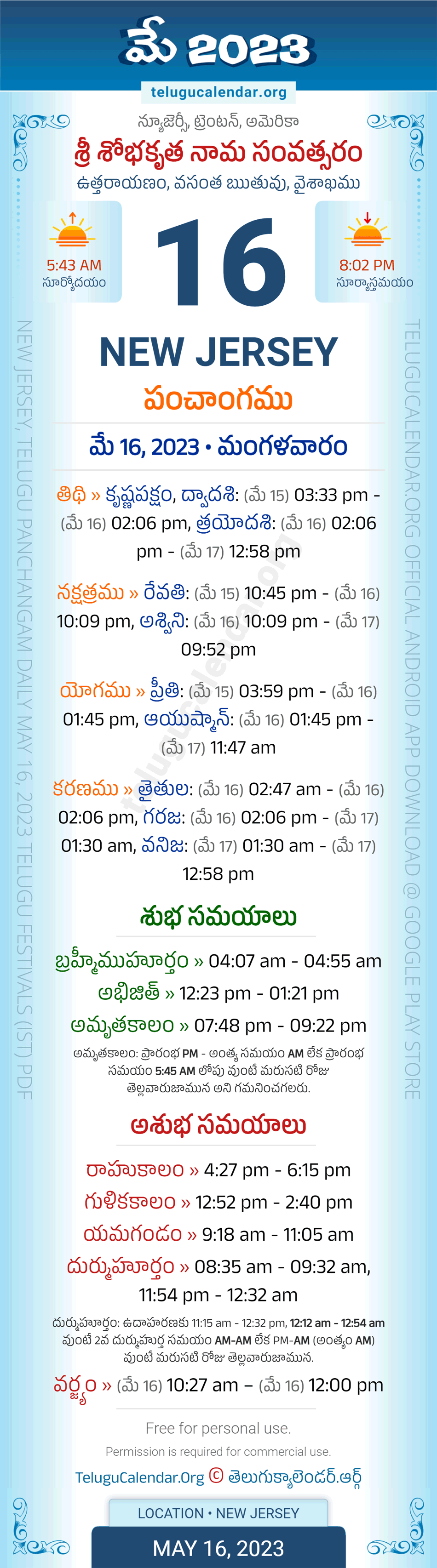 Download » May 16, 2023 » New Jersey (USA) Telugu Panchangam Daily Sheet with Auspicious and Inauspicious Timings.