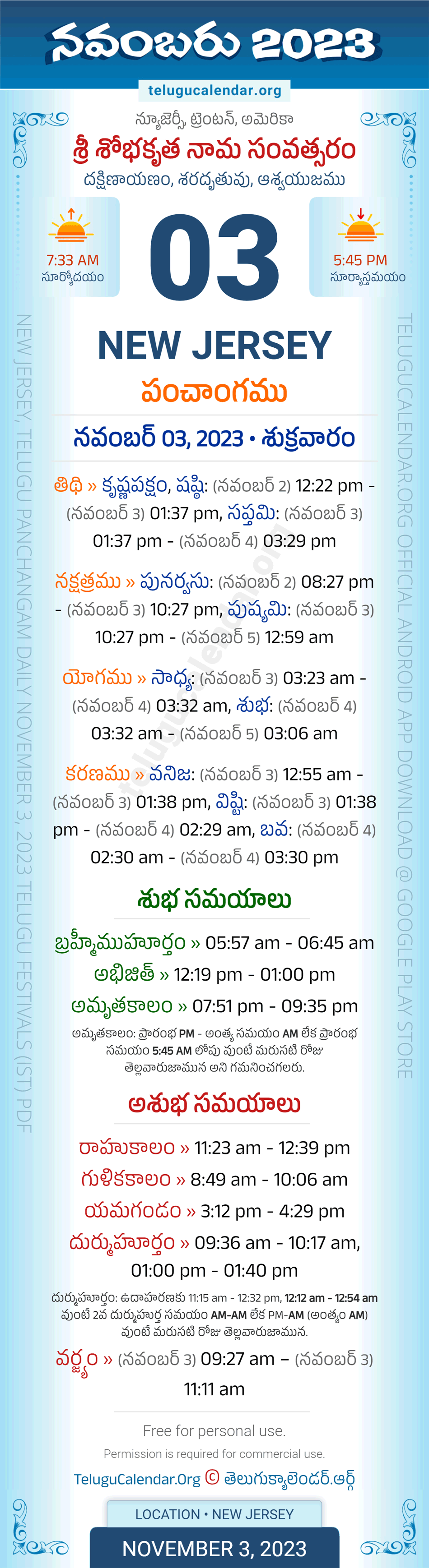 Download » November 3, 2023 » New Jersey (USA) Telugu Panchangam Daily Sheet with Auspicious and Inauspicious Timings.