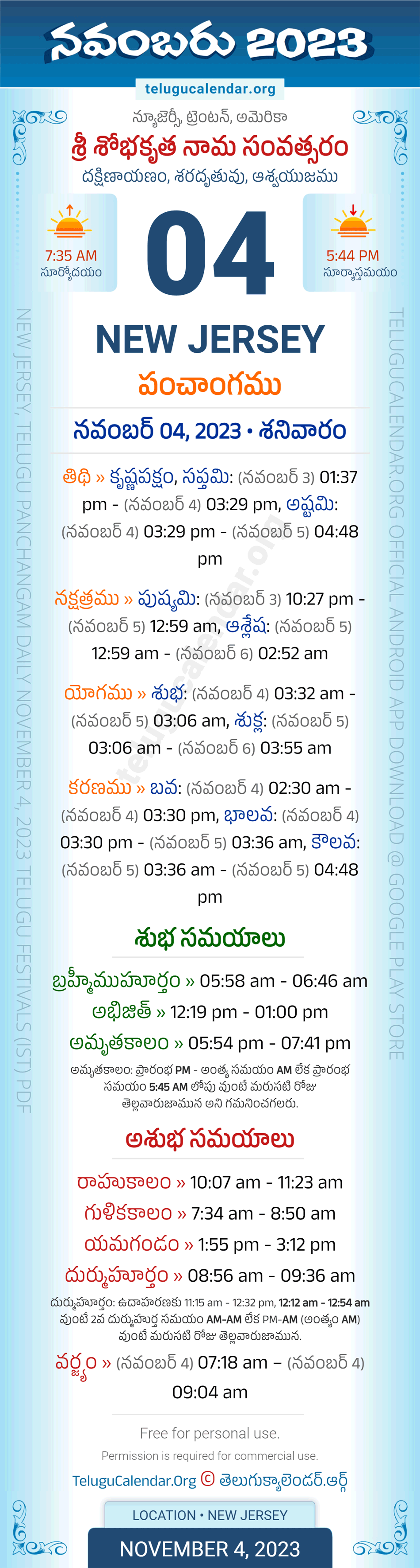 Download » November 4, 2023 » New Jersey (USA) Telugu Panchangam Daily Sheet with Auspicious and Inauspicious Timings.