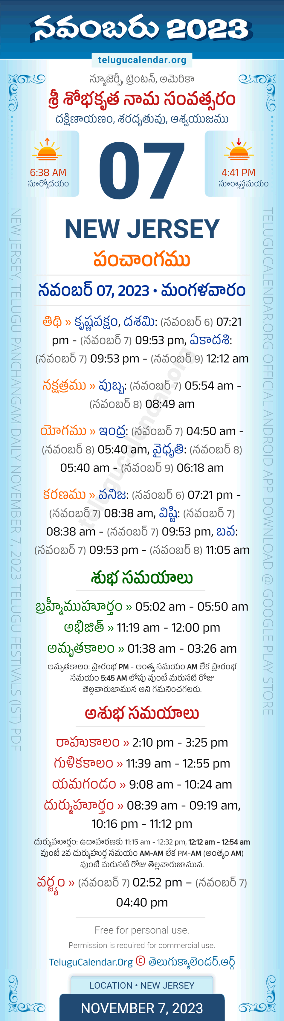 Download » November 7, 2023 » New Jersey (USA) Telugu Panchangam Daily Sheet with Auspicious and Inauspicious Timings.