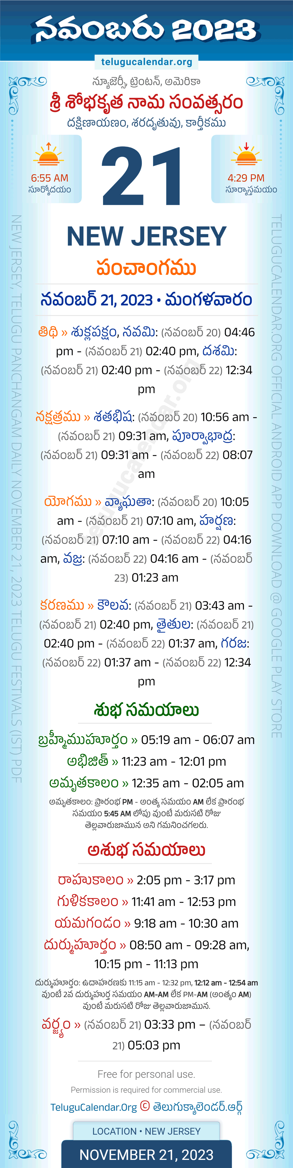 Download » November 21, 2023 » New Jersey (USA) Telugu Panchangam Daily Sheet with Auspicious and Inauspicious Timings.