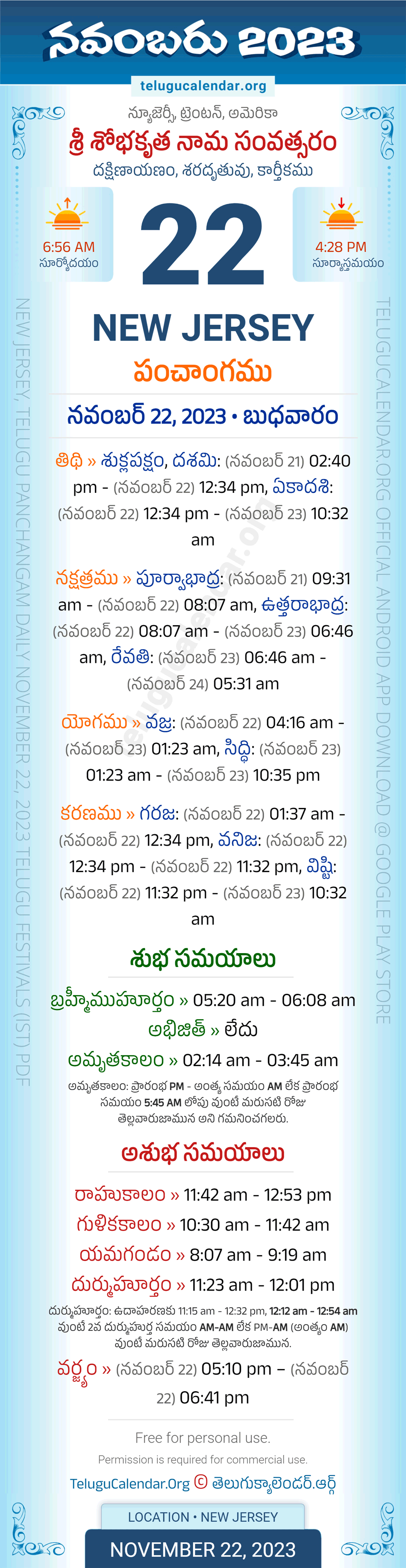 New Jersey Panchangam November 22, 2023 Daily Sheet in Telugu... New Jersey Telugu Panchangam Wednesday, November 22, 2023, Today's New Jersey Tithi: Sukla Paksham, Dashami: (Nov 21) 02:40 pm - (Nov 22) 12:34 pm, Ekadashi: (Nov 22) 12:34 pm - (Nov 23) 10:32 am, Today's New Jersey Nakshatram: Purva Bhadrapada: (Nov 21) 09:31 am - (Nov 22) 08:07 am, Uttara Bhadrapada: (Nov 22) 08:07 am - (Nov 23) 06:46 am, Revathi: (Nov 23) 06:46 am - (Nov 24) 05:31 am, Telugu Year: Sri Sobhakritu Nama Samvatsaram, Vedic Aayana: Dakshinayanam, Vedic Rutuvu: Sharad, Chandramasa (Amanta): Kartikamu. Below image showing information about the 5 attributes of the day, viz., Varam, Tithi, Nakshatram, Yogam & Karanam along with starting and end timings. Read more