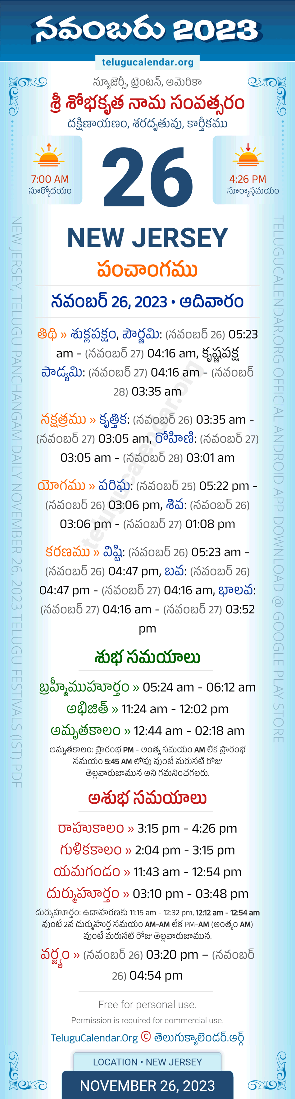 New Jersey Panchangam November 26, 2023 Daily Sheet in Telugu... New Jersey Telugu Panchangam Sunday, November 26, 2023, Today's New Jersey Tithi: Sukla Paksham, Pournami: (Nov 26) 05:23 am - (Nov 27) 04:16 am, Krishna Paksha Padyami: (Nov 27) 04:16 am - (Nov 28) 03:35 am, Today's New Jersey Nakshatram: Krithika: (Nov 26) 03:35 am - (Nov 27) 03:05 am, Krithika: (Nov 27) 03:05 am - (Nov 28) 03:01 am, Telugu Year: Sri Sobhakritu Nama Samvatsaram, Vedic Aayana: Dakshinayanam, Vedic Rutuvu: Sharad, Chandramasa (Amanta): Kartikamu. Below image showing information about the 5 attributes of the day, viz., Varam, Tithi, Nakshatram, Yogam & Karanam along with starting and end timings. Read more
