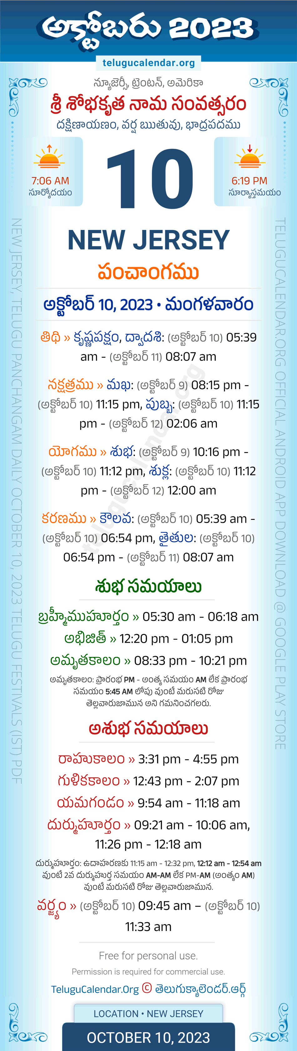 Download » October 10, 2023 » New Jersey (USA) Telugu Panchangam Daily Sheet with Auspicious and Inauspicious Timings.