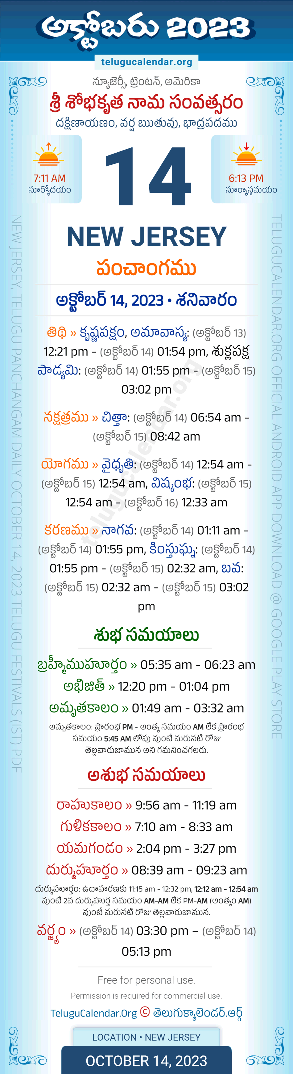 New Jersey Panchangam October 14, 2023 Daily Sheet in Telugu... New Jersey Telugu Panchangam Saturday, October 14, 2023, Today's New Jersey Tithi: Krishna Paksham, Amavasya: (Oct 13) 12:21 pm - (Oct 14) 01:54 pm, Sukla Paksha Padyami: (Oct 14) 01:55 pm - (Oct 15) 03:02 pm, Today's New Jersey Nakshatram: Chiththa: (Oct 14) 06:54 am - (Oct 15) 08:42 am, Telugu Year: Sri Sobhakritu Nama Samvatsaram, Vedic Aayana: Dakshinayanam, Vedic Rutuvu: Varsha, Chandramasa (Amanta): Bhadrapadamu. Below image showing information about the 5 attributes of the day, viz., Varam, Tithi, Nakshatram, Yogam & Karanam along with starting and end timings. Read more