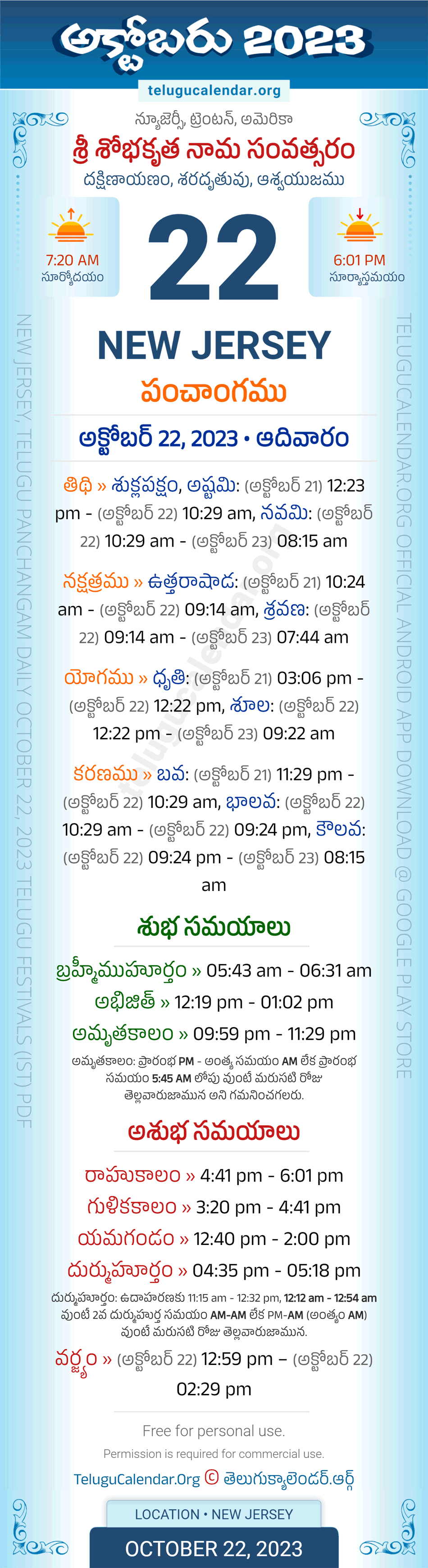 New Jersey Panchangam October 22, 2023 Daily Sheet in Telugu... New Jersey Telugu Panchangam Sunday, October 22, 2023, Today's New Jersey Tithi: Sukla Paksham, Ashtami: (Oct 21) 12:23 pm - (Oct 22) 10:29 am, Navami: (Oct 22) 10:29 am - (Oct 23) 08:15 am, Today's New Jersey Nakshatram: Uttara Ashadha: (Oct 21) 10:24 am - (Oct 22) 09:14 am, Sravanamu: (Oct 22) 09:14 am - (Oct 23) 07:44 am, Telugu Year: Sri Sobhakritu Nama Samvatsaram, Vedic Aayana: Dakshinayanam, Vedic Rutuvu: Sharad, Chandramasa (Amanta): Ashwayujamu. Below image showing information about the 5 attributes of the day, viz., Varam, Tithi, Nakshatram, Yogam & Karanam along with starting and end timings. Read more