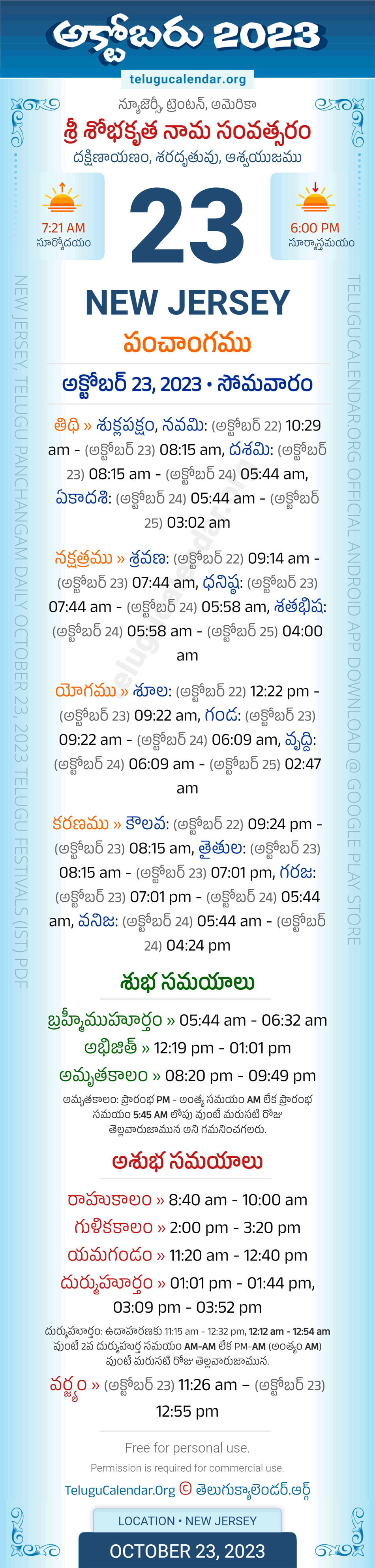 Apart from the Panchangam October 23, 2023 New Jersey Telugu Calendar Daily Sheet, you can also find the Sunrise and Sunset (Middle Limb) timings, Paksham, Telugu Year, Yanam, Rutuvu, Telugu Month. Today's New Jersey Auspicious Timings October 23, 2023 (Shubha Muhuratam Today Good Timings like Abhijit Muhurtham, Amruta Kalam & Brahma Muhurtham) and Today's New Jersey Inauspicious Timings October 23, 2023 (Bad Timings like Durmuhurtham, Rahukalam, Gulika kalam & Yamagandam) with starting and end timings in the above image.