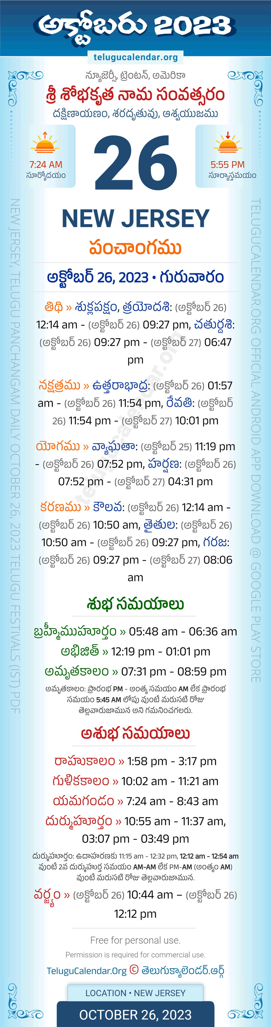 New Jersey Panchangam October 26, 2023 Daily Sheet in Telugu... New Jersey Telugu Panchangam Thursday, October 26, 2023, Today's New Jersey Tithi: Sukla Paksham, Trayodashi: (Oct 26) 12:14 am - (Oct 26) 09:27 pm, Chaturdashi: (Oct 26) 09:27 pm - (Oct 27) 06:47 pm, Today's New Jersey Nakshatram: Uttara Bhadrapada: (Oct 26) 01:57 am - (Oct 26) 11:54 pm, Revathi: (Oct 26) 11:54 pm - (Oct 27) 10:01 pm, Telugu Year: Sri Sobhakritu Nama Samvatsaram, Vedic Aayana: Dakshinayanam, Vedic Rutuvu: Sharad, Chandramasa (Amanta): Ashwayujamu. Below image showing information about the 5 attributes of the day, viz., Varam, Tithi, Nakshatram, Yogam & Karanam along with starting and end timings. Read more