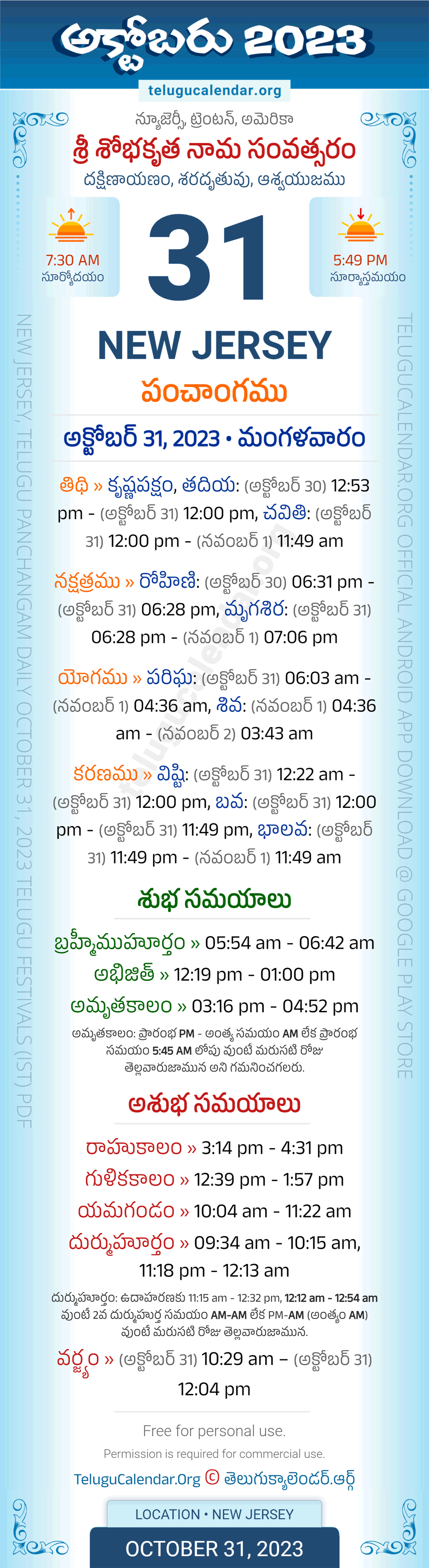 New Jersey Panchangam October 31, 2023 Daily Sheet in Telugu... New Jersey Telugu Panchangam Tuesday, October 31, 2023, Today's New Jersey Tithi: Krishna Paksham, Thadiya: (Oct 30) 12:53 pm - (Oct 31) 12:00 pm, Chavithi: (Oct 31) 12:00 pm - (Nov 1) 11:49 am, Today's New Jersey Nakshatram: Krithika: (Oct 30) 06:31 pm - (Oct 31) 06:28 pm, Mrigasira: (Oct 31) 06:28 pm - (Nov 1) 07:06 pm, Telugu Year: Sri Sobhakritu Nama Samvatsaram, Vedic Aayana: Dakshinayanam, Vedic Rutuvu: Sharad, Chandramasa (Amanta): Ashwayujamu. Below image showing information about the 5 attributes of the day, viz., Varam, Tithi, Nakshatram, Yogam & Karanam along with starting and end timings. Read more