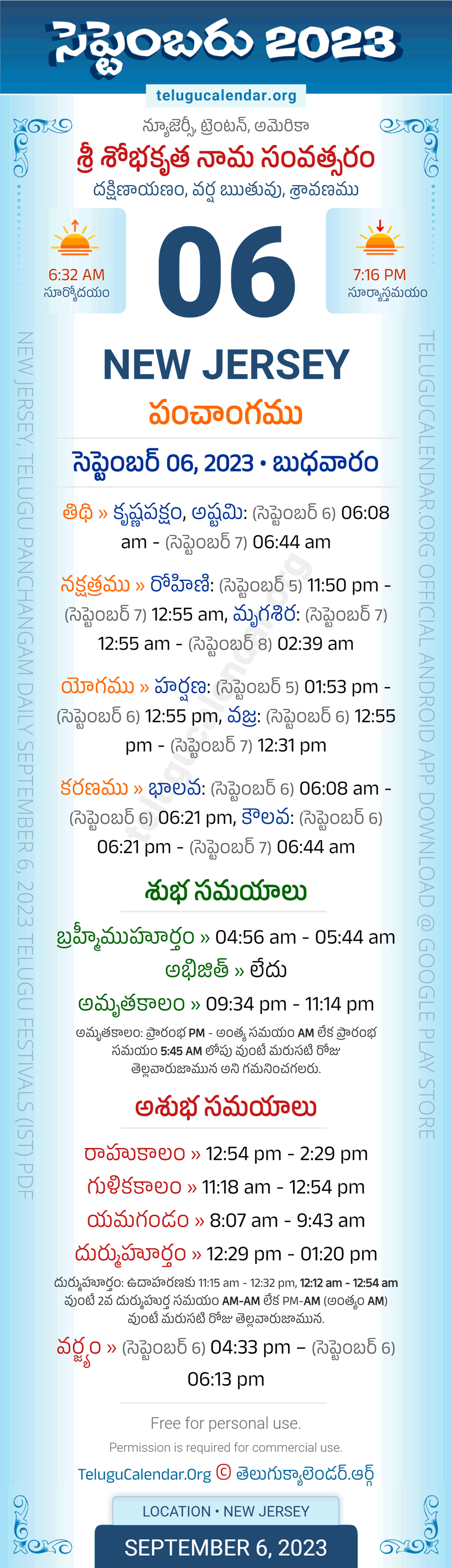 New Jersey Panchangam September 6, 2023 Daily Sheet in Telugu... New Jersey Telugu Panchangam Wednesday, September 06, 2023, Today's New Jersey Tithi: Krishna Paksham, Ashtami: (Sep 6) 06:08 am - (Sep 7) 06:44 am, Today's New Jersey Nakshatram: Krithika: (Sep 5) 11:50 pm - (Sep 7) 12:55 am, Mrigasira: (Sep 7) 12:55 am - (Sep 8) 02:39 am, Telugu Year: Sri Sobhakritu Nama Samvatsaram, Vedic Aayana: Dakshinayanam, Vedic Rutuvu: Varsha, Chandramasa (Amanta): Sravanamu. Below image showing information about the 5 attributes of the day, viz., Varam, Tithi, Nakshatram, Yogam & Karanam along with starting and end timings. Read more