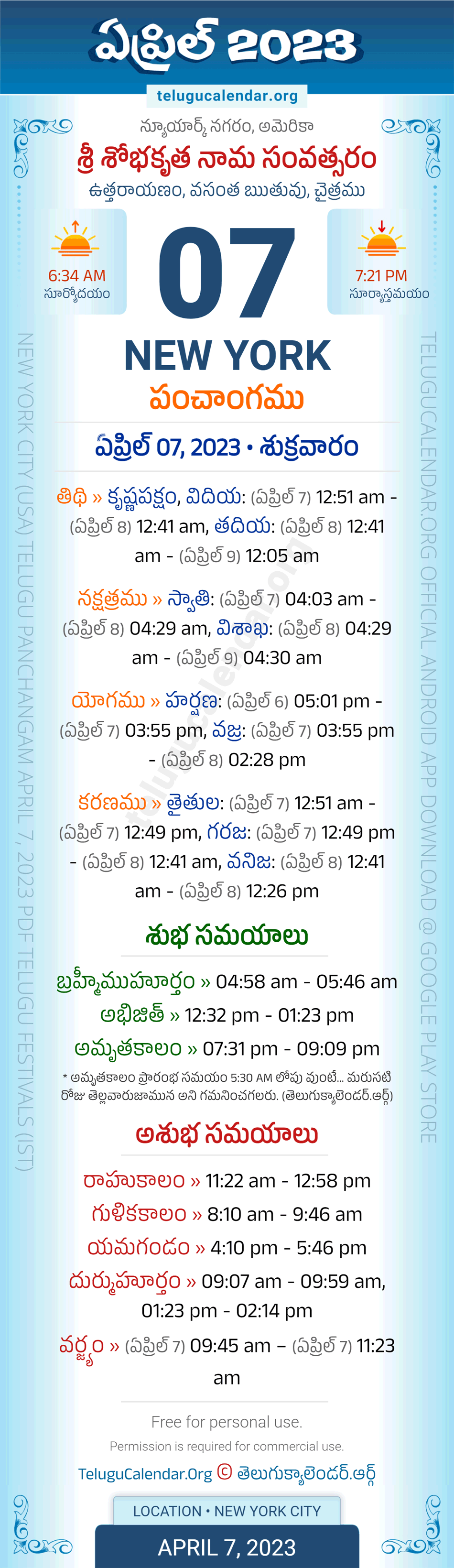 Download » April 7, 2023 » New York (USA) Telugu Panchangam Daily Sheet with Auspicious and Inauspicious Timings.