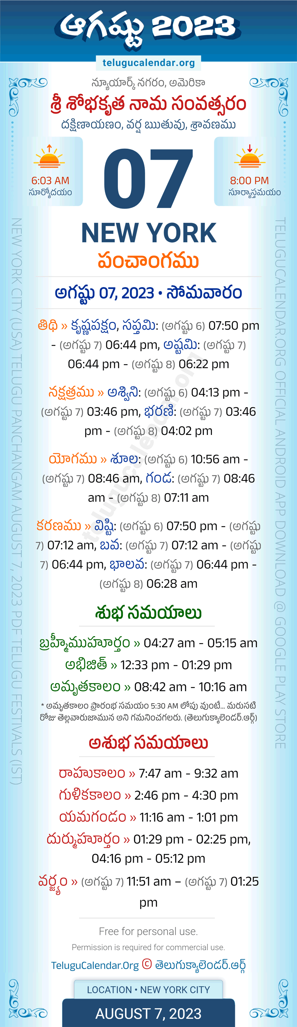 New York Panchangam August 7, 2023 Daily Sheet in Telugu... New York Telugu Panchangam Monday, August 07, 2023, Today's New York Tithi: Krishna Paksham, Saptami: (Aug 6) 07:50 pm - (Aug 7) 06:44 pm, Ashtami: (Aug 7) 06:44 pm - (Aug 8) 06:22 pm, Today's New York Nakshatram: Aswini: (Aug 6) 04:13 pm - (Aug 7) 03:46 pm, Bharani: (Aug 7) 03:46 pm - (Aug 8) 04:02 pm, Telugu Year: Sri Sobhakritu Nama Samvatsaram, Vedic Aayana: Dakshinayanam, Vedic Rutuvu: Varsha, Chandramasa (Amanta): Sravanamu. Below image showing information about the 5 attributes of the day, viz., Varam, Tithi, Nakshatram, Yogam & Karanam along with starting and end timings. Read more