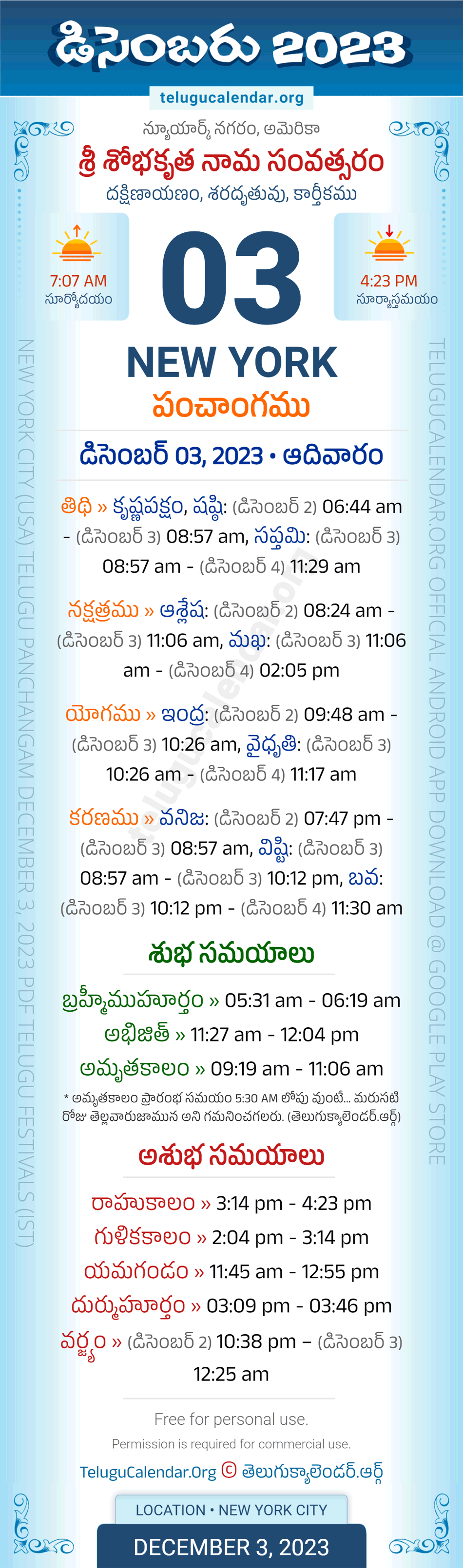 Download » December 3, 2023 » New York (USA) Telugu Panchangam Daily Sheet with Auspicious and Inauspicious Timings.