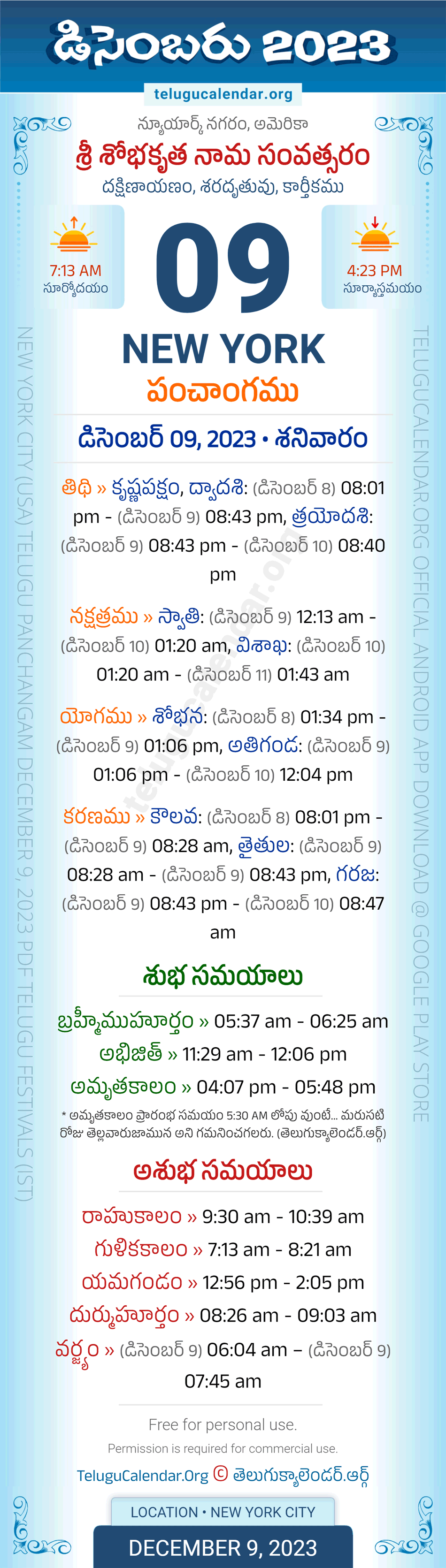 New York Panchangam December 9, 2023 Daily Sheet in Telugu... New York Telugu Panchangam Saturday, December 09, 2023, Today's New York Tithi: Krishna Paksham, Dwadasi: (Dec 8) 08:01 pm - (Dec 9) 08:43 pm, Trayodashi: (Dec 9) 08:43 pm - (Dec 10) 08:40 pm, Today's New York Nakshatram: Swathi: (Dec 9) 12:13 am - (Dec 10) 01:20 am, Visakha: (Dec 10) 01:20 am - (Dec 11) 01:43 am, Telugu Year: Sri Sobhakritu Nama Samvatsaram, Vedic Aayana: Dakshinayanam, Vedic Rutuvu: Sharad, Chandramasa (Amanta): Kartikamu. Below image showing information about the 5 attributes of the day, viz., Varam, Tithi, Nakshatram, Yogam & Karanam along with starting and end timings. Read more