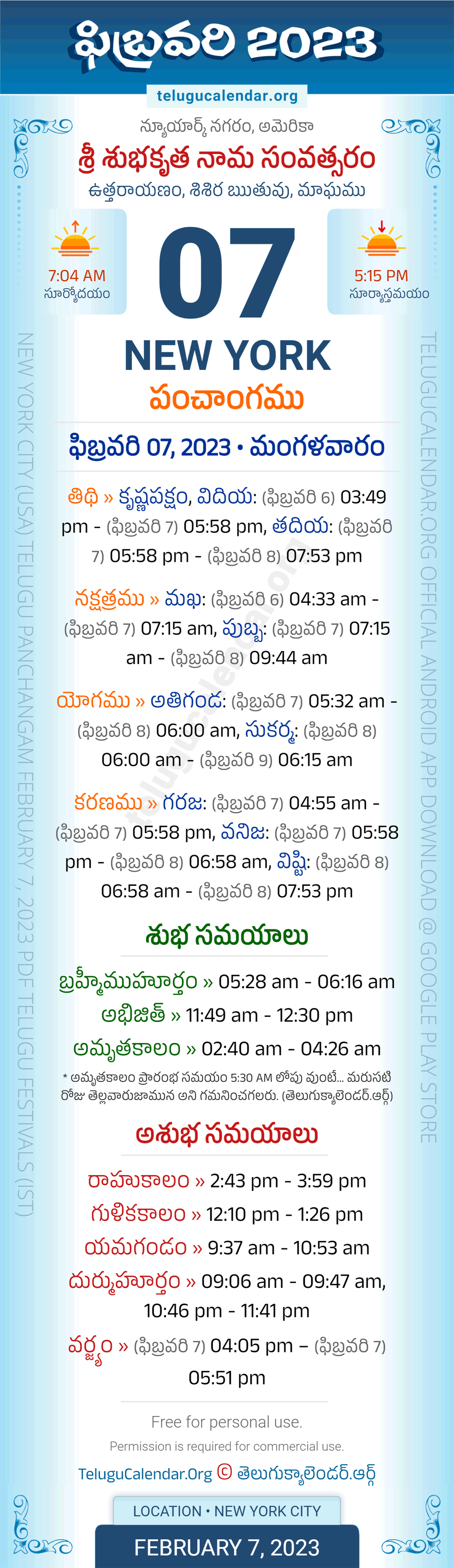 Download » February 7, 2023 » New York (USA) Telugu Panchangam Daily Sheet with Auspicious and Inauspicious Timings.