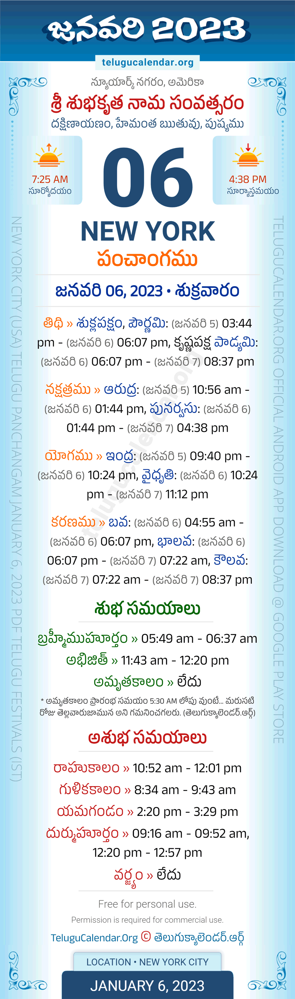 Download » January 6, 2023 » New York (USA) Telugu Panchangam Daily Sheet with Auspicious and Inauspicious Timings.