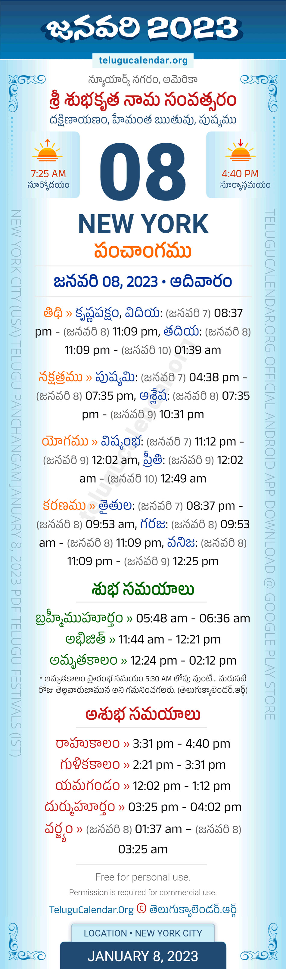 Download » January 8, 2023 » New York (USA) Telugu Panchangam Daily Sheet with Auspicious and Inauspicious Timings.