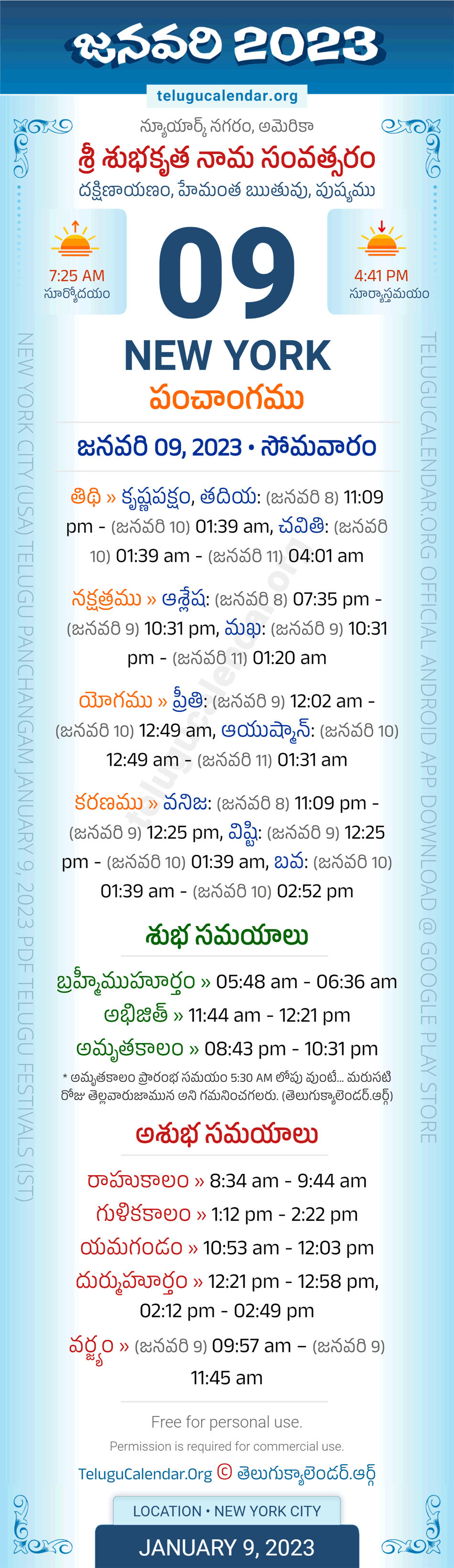 Download » January 9, 2023 » New York (USA) Telugu Panchangam Daily Sheet with Auspicious and Inauspicious Timings.