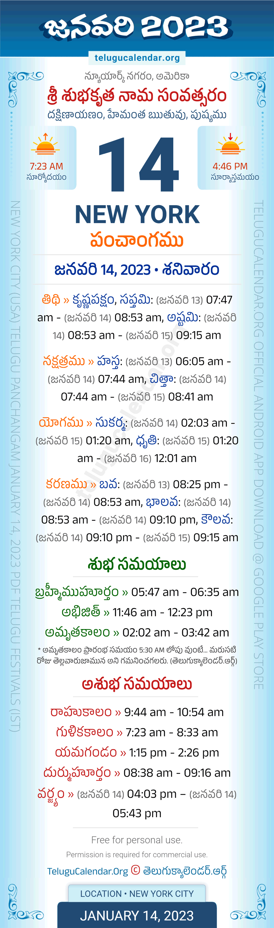 Download » January 14, 2023 » New York (USA) Telugu Panchangam Daily Sheet with Auspicious and Inauspicious Timings.