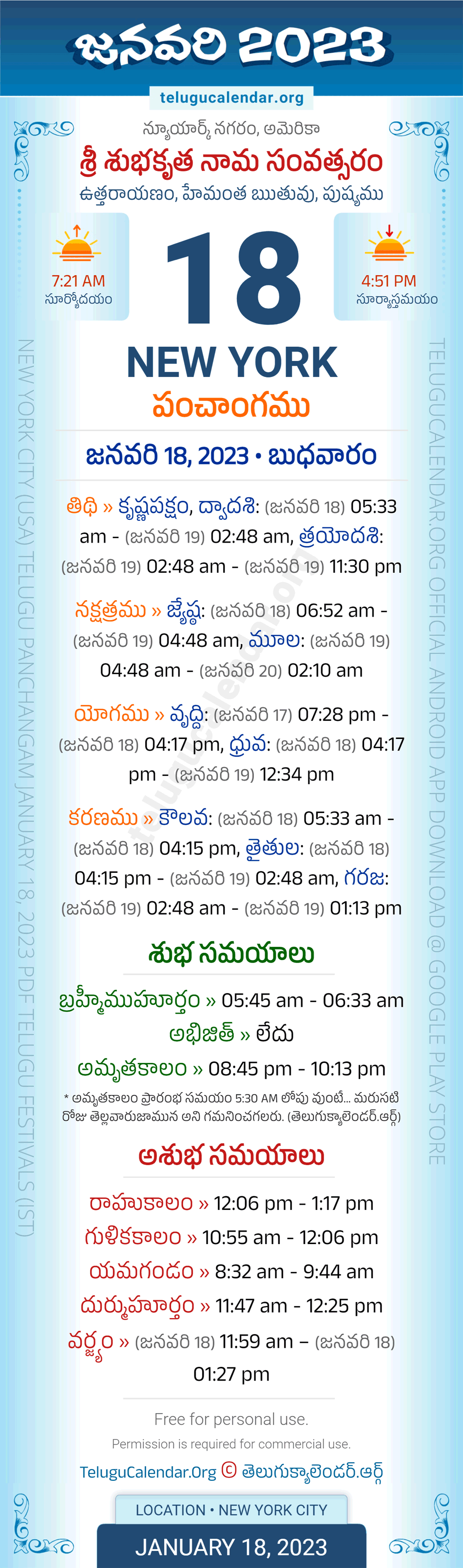 Download » January 18, 2023 » New York (USA) Telugu Panchangam Daily Sheet with Auspicious and Inauspicious Timings.