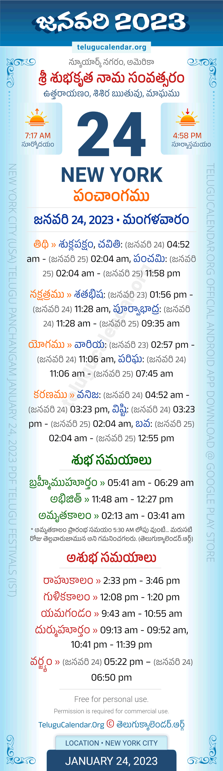 Download » January 24, 2023 » New York (USA) Telugu Panchangam Daily Sheet with Auspicious and Inauspicious Timings.