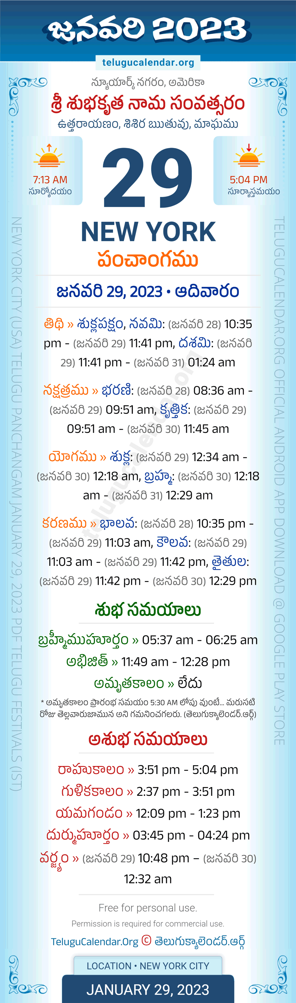 Download » January 29, 2023 » New York (USA) Telugu Panchangam Daily Sheet with Auspicious and Inauspicious Timings.