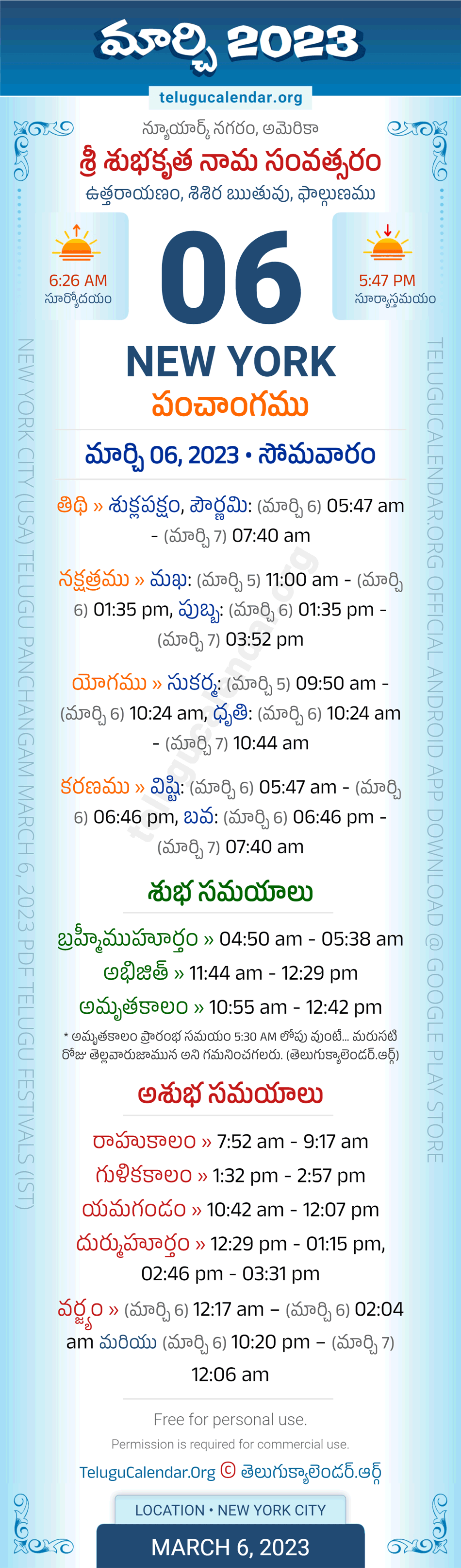 Download » March 6, 2023 » New York (USA) Telugu Panchangam Daily Sheet with Auspicious and Inauspicious Timings.