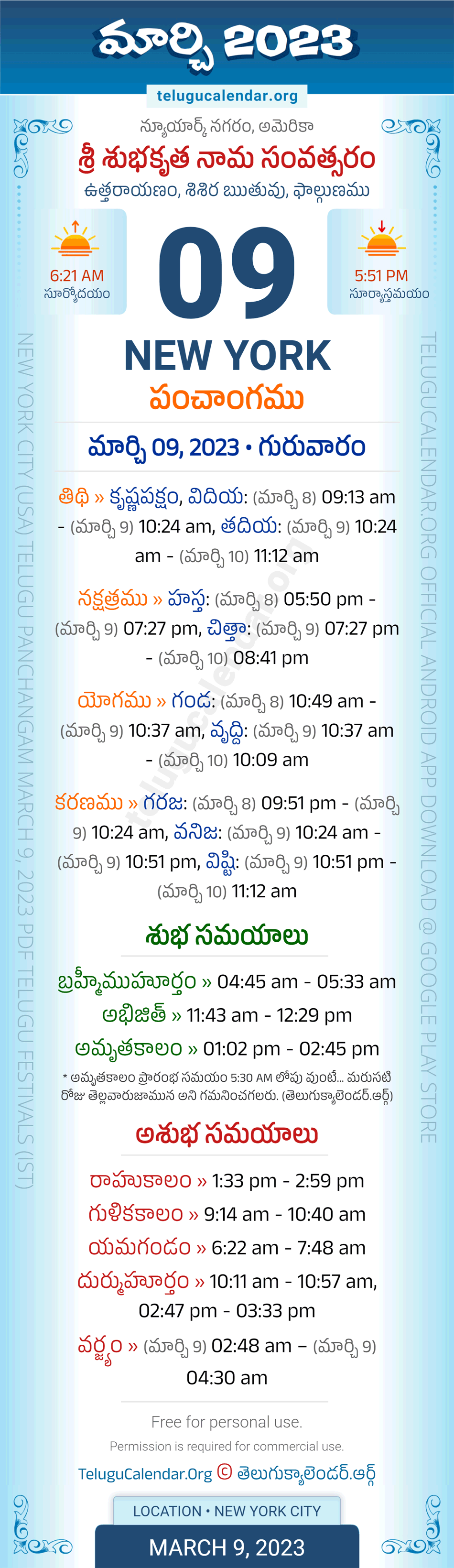 Download » March 9, 2023 » New York (USA) Telugu Panchangam Daily Sheet with Auspicious and Inauspicious Timings.