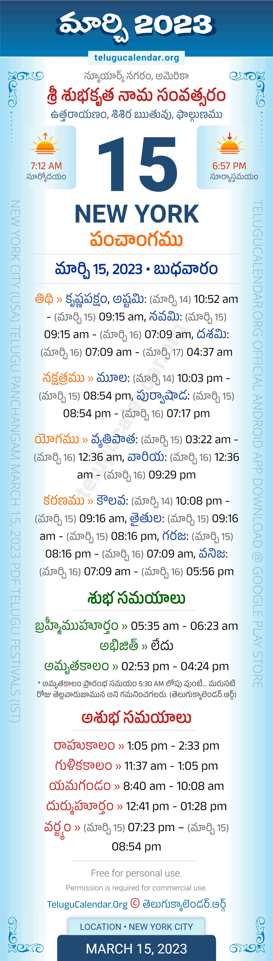 Download » March 15, 2023 » New York (USA) Telugu Panchangam Daily Sheet with Auspicious and Inauspicious Timings.