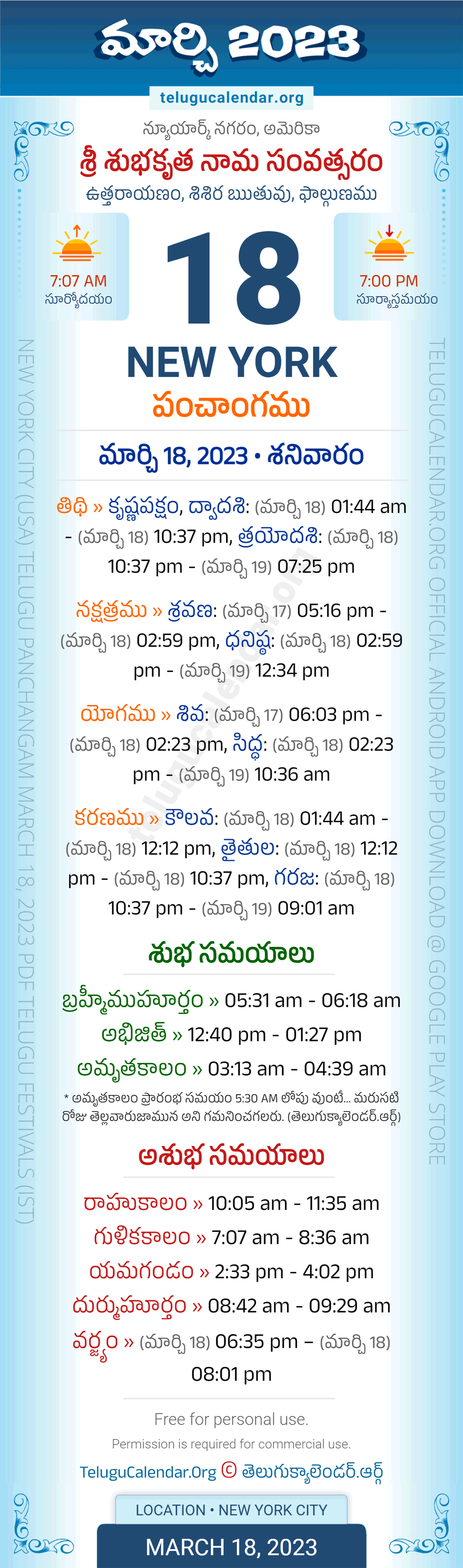 Download » March 18, 2023 » New York (USA) Telugu Panchangam Daily Sheet with Auspicious and Inauspicious Timings.