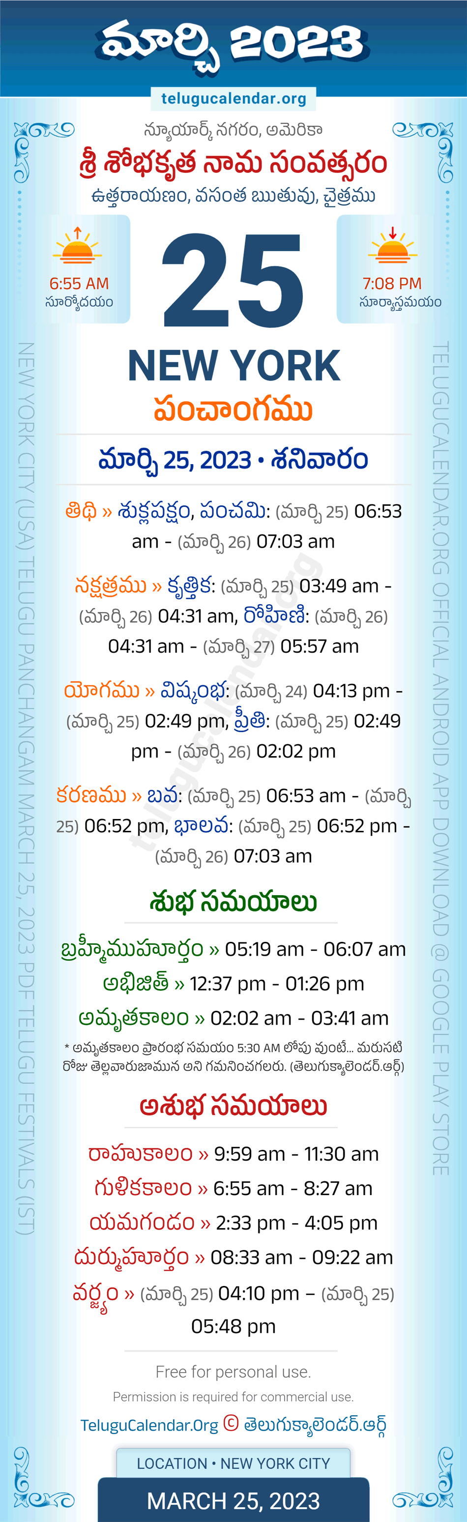 Download » March 25, 2023 » New York (USA) Telugu Panchangam Daily Sheet with Auspicious and Inauspicious Timings.