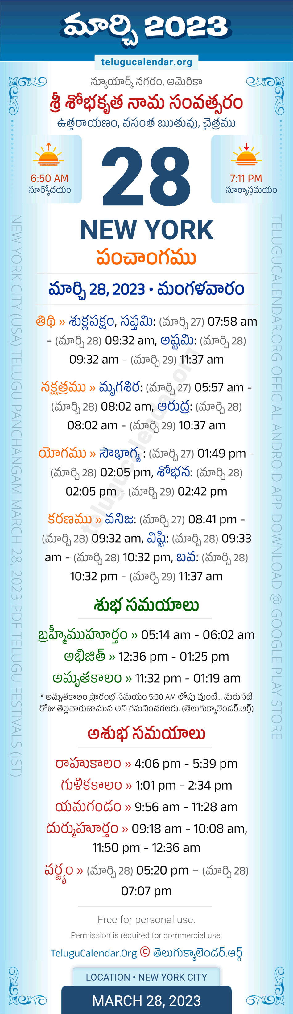 Download » March 28, 2023 » New York (USA) Telugu Panchangam Daily Sheet with Auspicious and Inauspicious Timings.