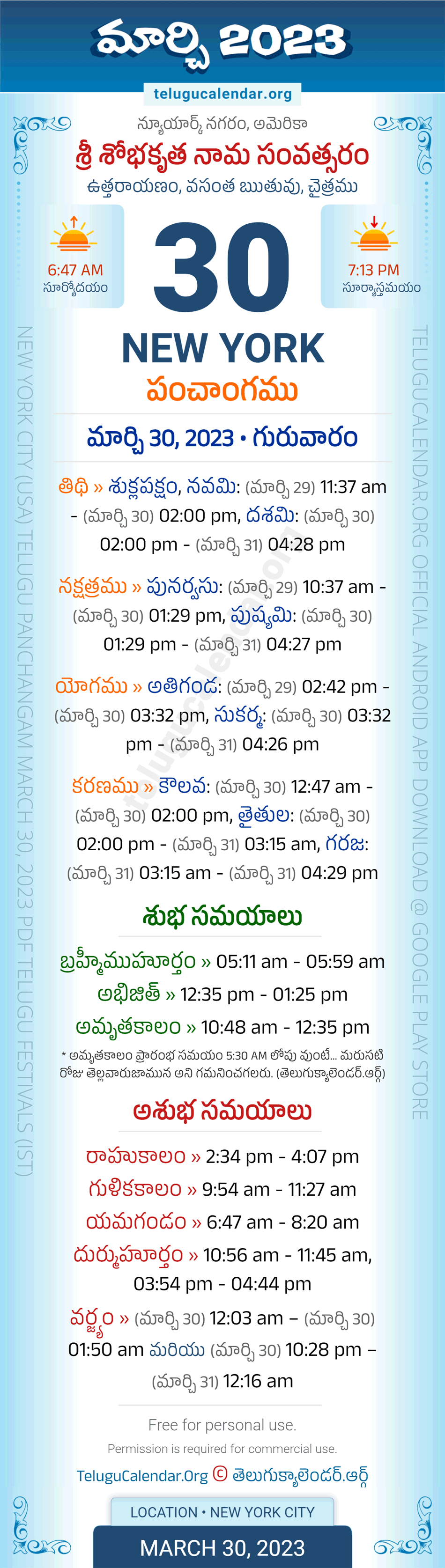 Download » March 30, 2023 » New York (USA) Telugu Panchangam Daily Sheet with Auspicious and Inauspicious Timings.
