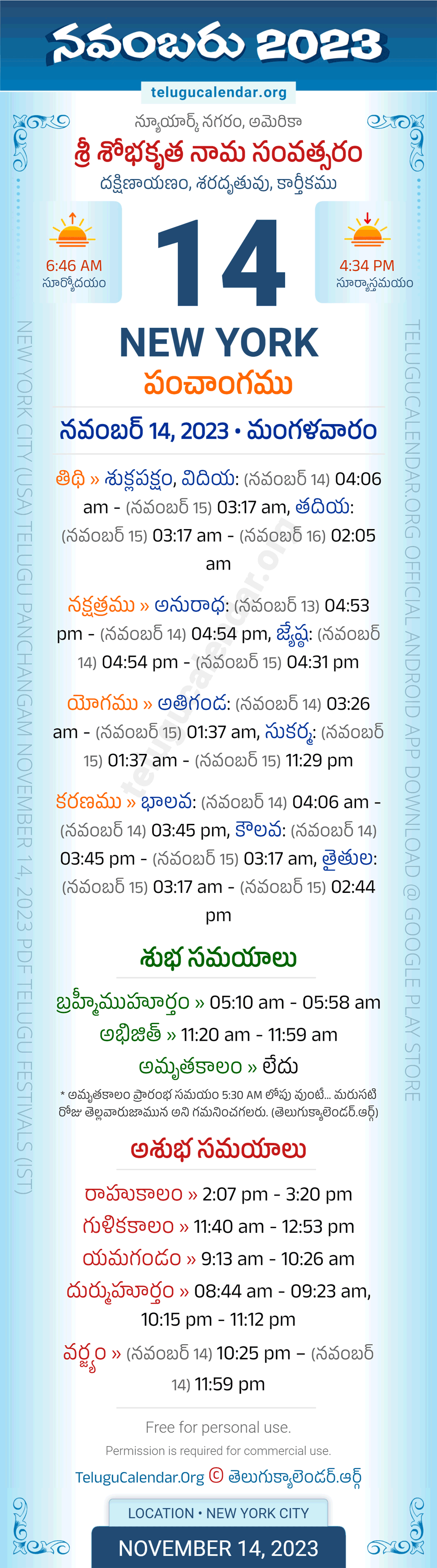 Download » November 14, 2023 » New York (USA) Telugu Panchangam Daily Sheet with Auspicious and Inauspicious Timings.