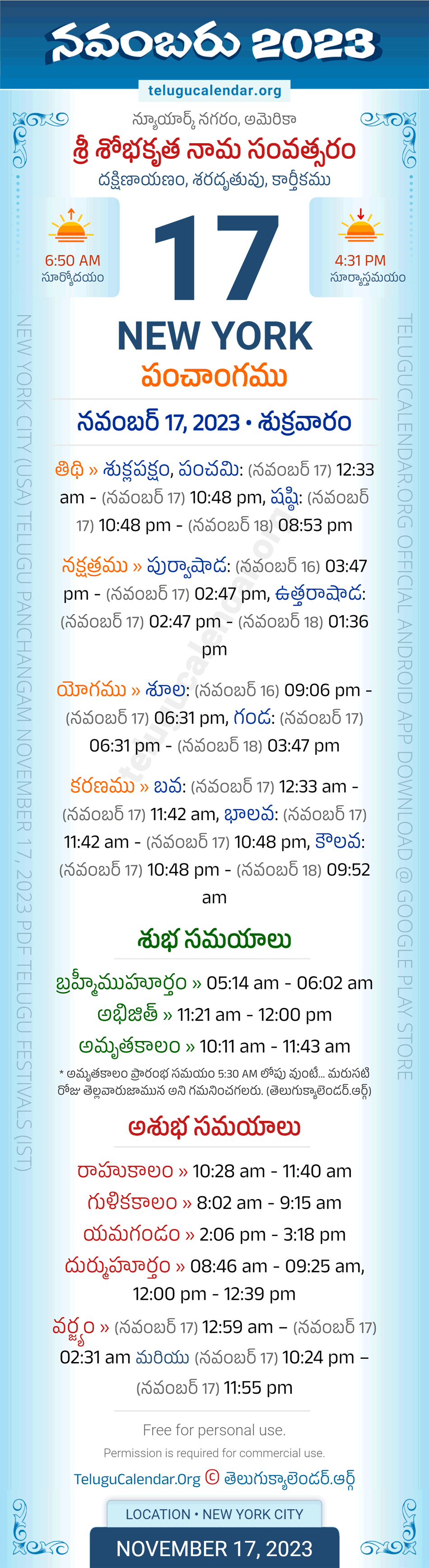 Download » November 17, 2023 » New York (USA) Telugu Panchangam Daily Sheet with Auspicious and Inauspicious Timings.