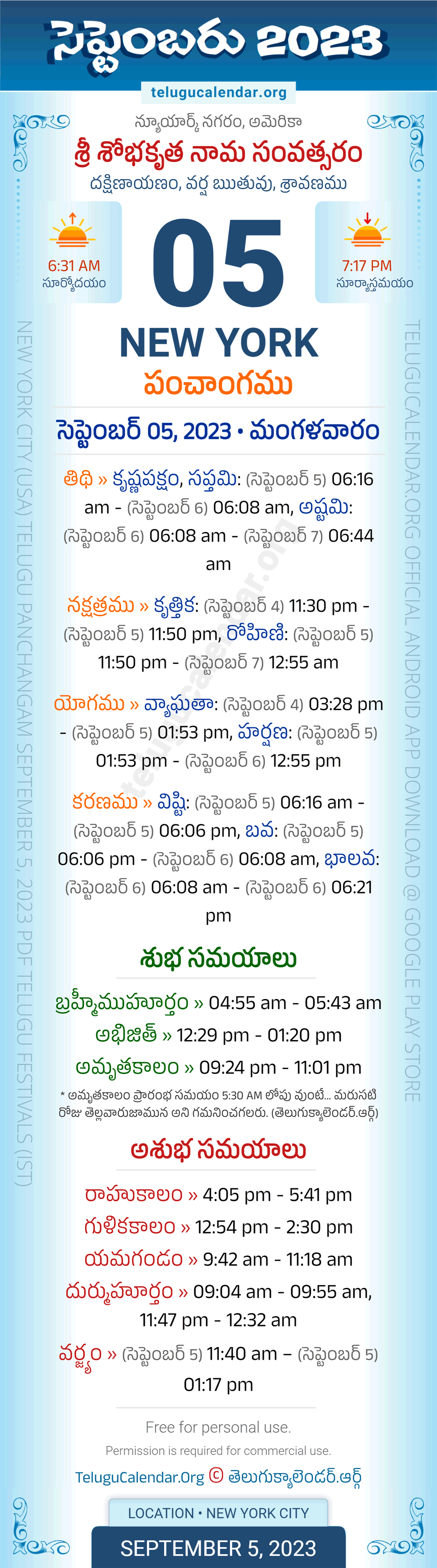 Download » September 5, 2023 » New York (USA) Telugu Panchangam Daily Sheet with Auspicious and Inauspicious Timings.