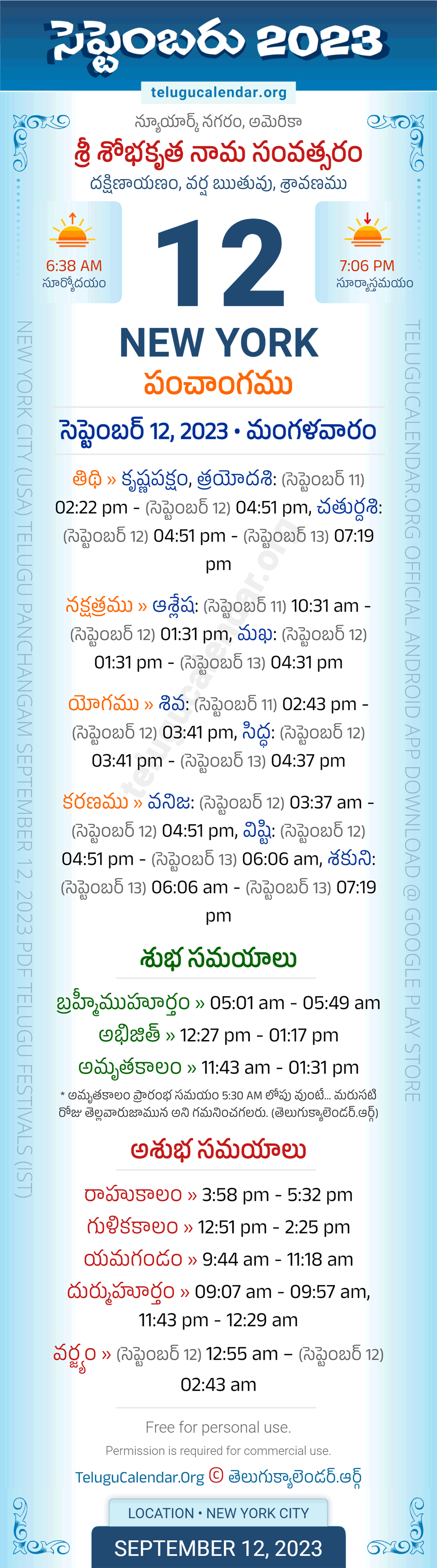 Download » September 12, 2023 » New York (USA) Telugu Panchangam Daily Sheet with Auspicious and Inauspicious Timings.