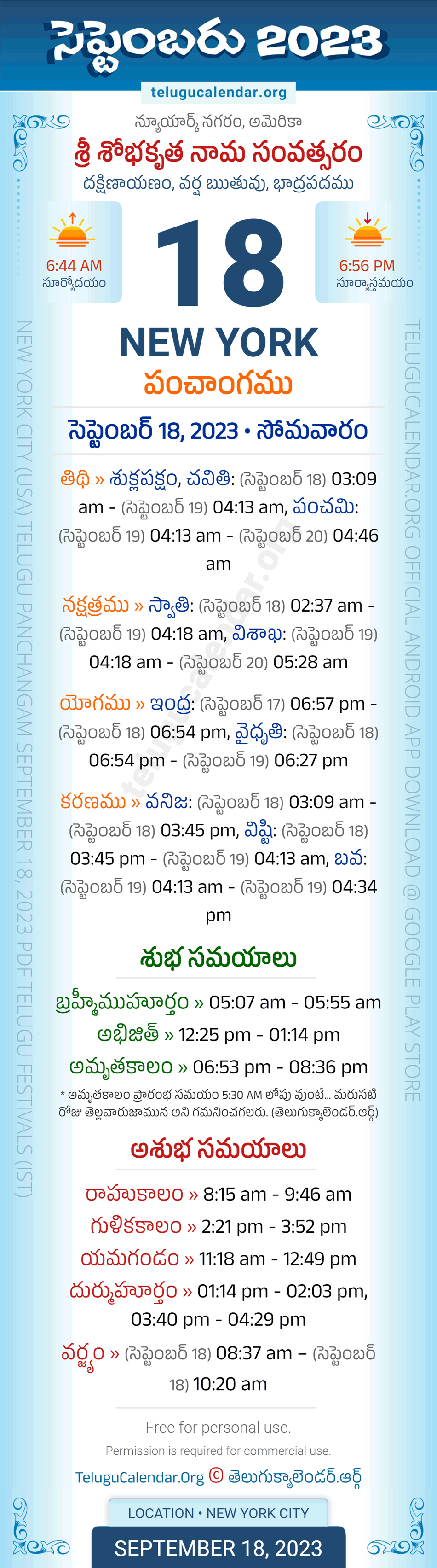 Download » September 18, 2023 » New York (USA) Telugu Panchangam Daily Sheet with Auspicious and Inauspicious Timings.