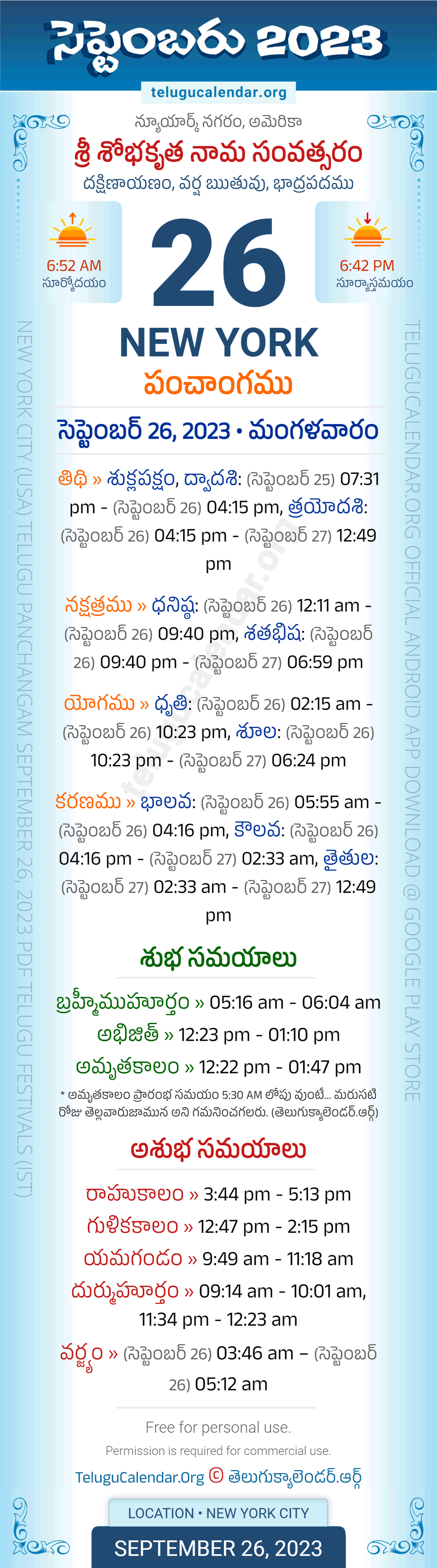 Download » September 26, 2023 » New York (USA) Telugu Panchangam Daily Sheet with Auspicious and Inauspicious Timings.